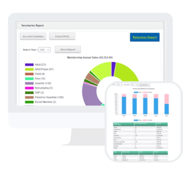 The Secretary Report provides you with a ready-made multi-year comparison report for the club AGM detailing revenue from online sources and a breakdown of club membership by type, gender, etc. This report also includes a link to Retention Reports which allow you to see where members are dropping off each year.