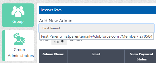 The registrar adds the coach as a group administrator by simply selecting the relevant group from the blue dropdown menu and adding the email address of the coach. If they are already a club member, their email address is recognised and they can be added instantly, if not, they are first verified via two-factor authentication and then confirmed as group administrators.