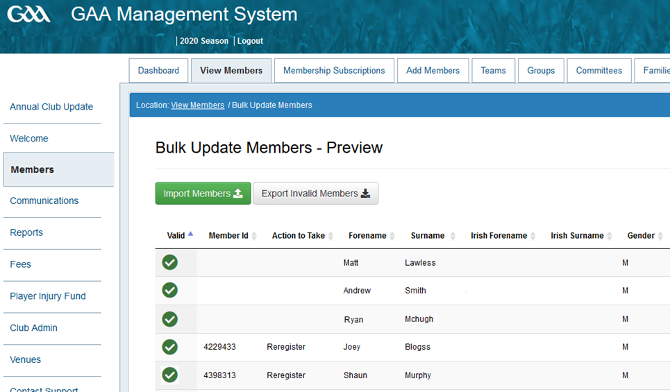 - The registrar selects the relevant registration forms (i.e. the current year) to import into the GAA GMS system and chooses how to action the membership record (review / update / verify) for each member