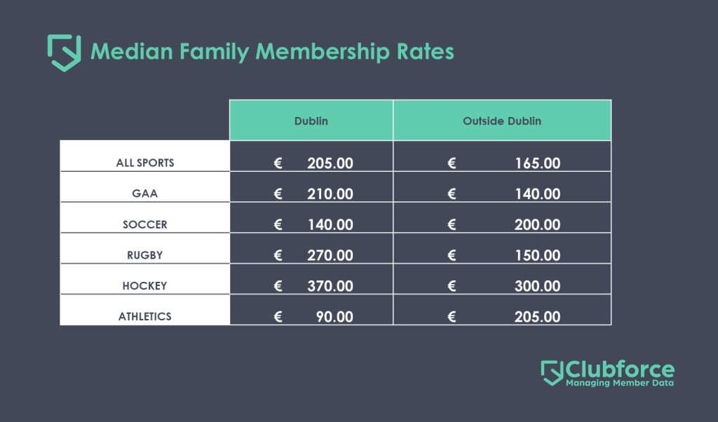 Aggregating the membership data across various sports in Ireland shows a median price nationally of €165 per year for a family membership. The make-up of family membership differs depending on sport (e.g. 2 adults, 2 children vs. 1-adult, 3 children) and the median rates for five sports with the highest participation levels are shown in the table below for comparison, with separate columns for Dublin and everything outside Dublin.
